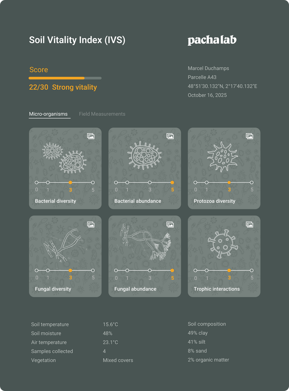 Ontvang een totaalscore op basis van de hoeveelheid en diversiteit van de vier belangrijkste groepen micro-organismen die essentieel zijn voor het bodem evenwicht.
